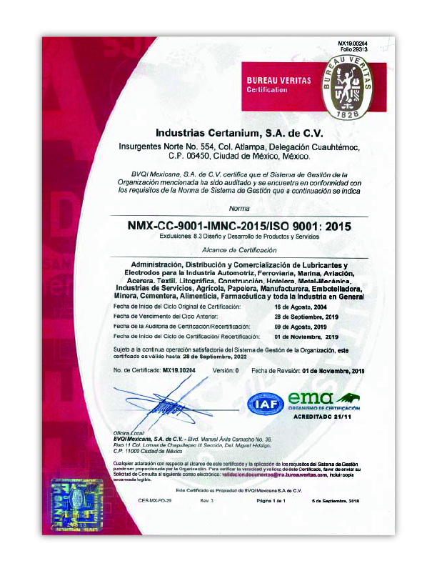 La Dirección de INDUSTRIAS CERTANIUM S.A. DE C.V. hace público su compromiso, con sus clientes, trabajadores y medio ambiente, la eficiencia de su Sistema de Gestión de Calidad estableciendo objetivos medibles, los cuales se revisarán periódicamente asegurando la mejora continua.